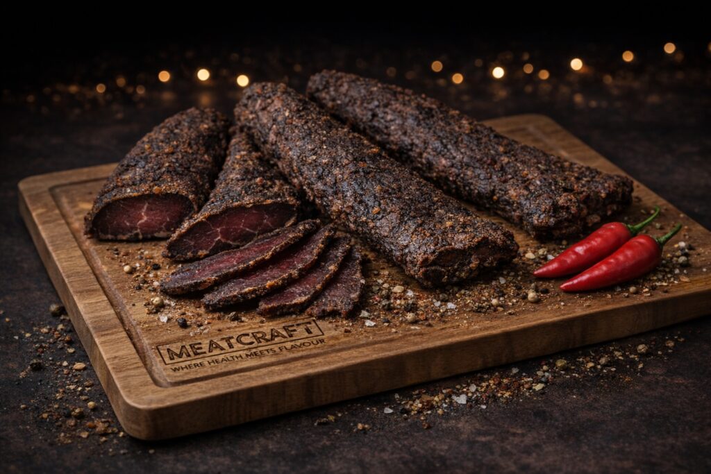 Biltong is a traditional air-dried beef snack, naturally high in protein and low in carbs.